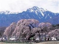 八ヶ岳を望む絶好のロケーションに咲く、県内でもまれに見る巨木の桜。樹高約9m、幹囲約8m、枝張り20m余り、樹齢約400年のエドヒガンザクラの変種。地元では「花が一斉に開くときは豊年」といい伝えられている。1959(昭和34)年、山梨県の天然記念物に指定された。現在は樹木を守るための風防ネットを設置しているため、写真とは景観が異なるので注意。